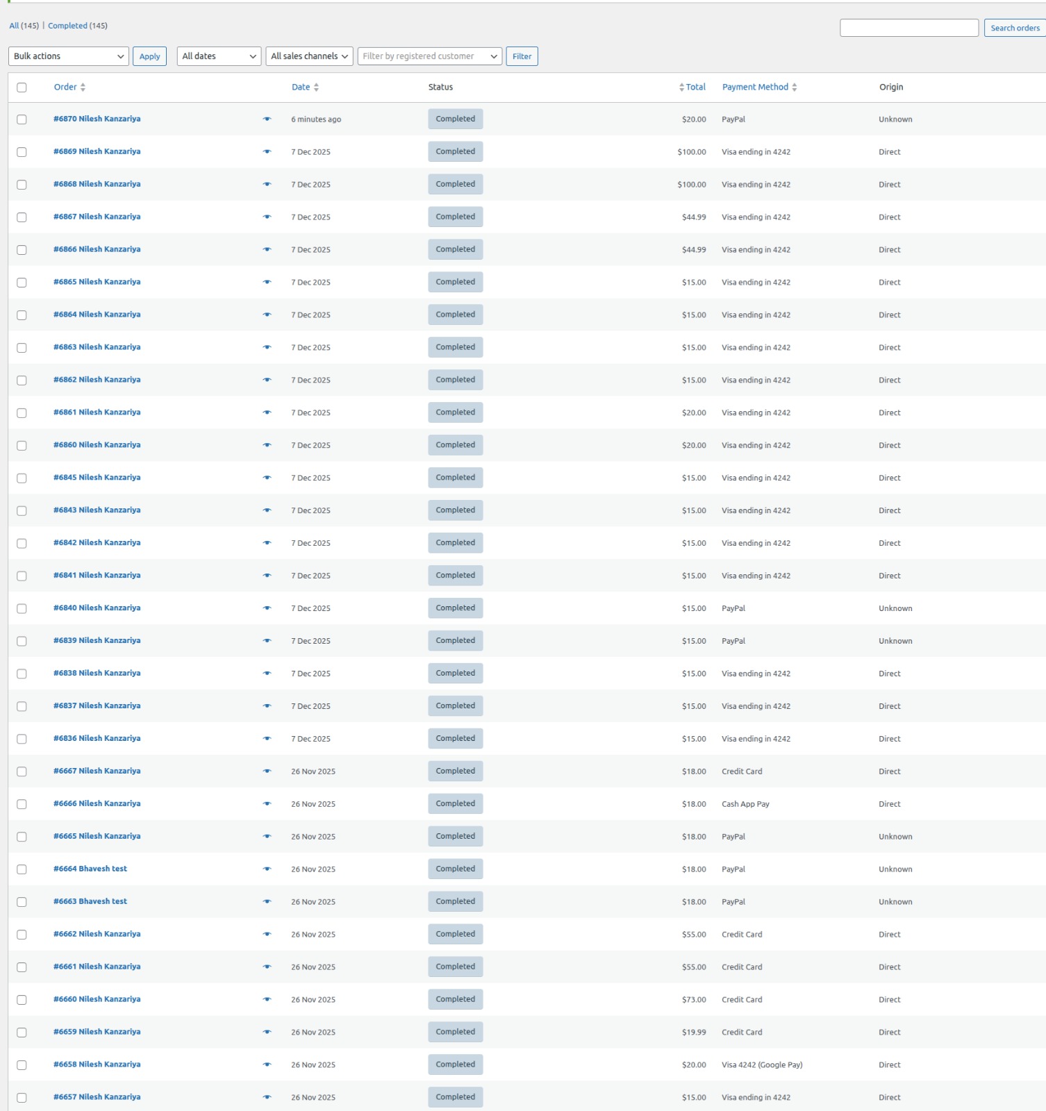 Orders automatically marked as “Completed” in the WooCommerce orders list.